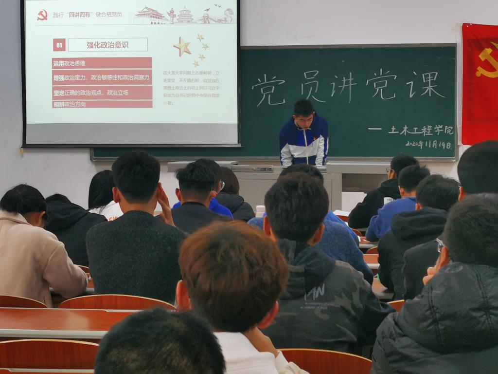 首先,张小梅以“在奋斗中实现青春梦想”为主题,从实例中讲述党员应该坚定远大理想,勇担时代挑战,坚持踏实躬行,矢志艰苦奋斗。引用习总书记的讲话“幸福靠奋斗,兴邦靠实干”,要求青年大学生党员在日常的学习、工作、生活中做好表率,发挥好先锋模范作用。钱涛同志从什么是“四讲四有”和怎样践行“四讲四有”进行了阐释,期望全体同志深入践行“四讲四有”,做合格党员。姜渝同志用一段视频开篇,讲述共产党员应发扬艰苦奋斗厉行勤俭节约道德品质,厉行勤俭节约,推动勤俭节约新风尚。冯兴鸿同志带领学习党史、新中国史、改革开放史、社会主义发展史,号召同学们不断增强“四个自信”,坚持不忘初心,牢记使命。