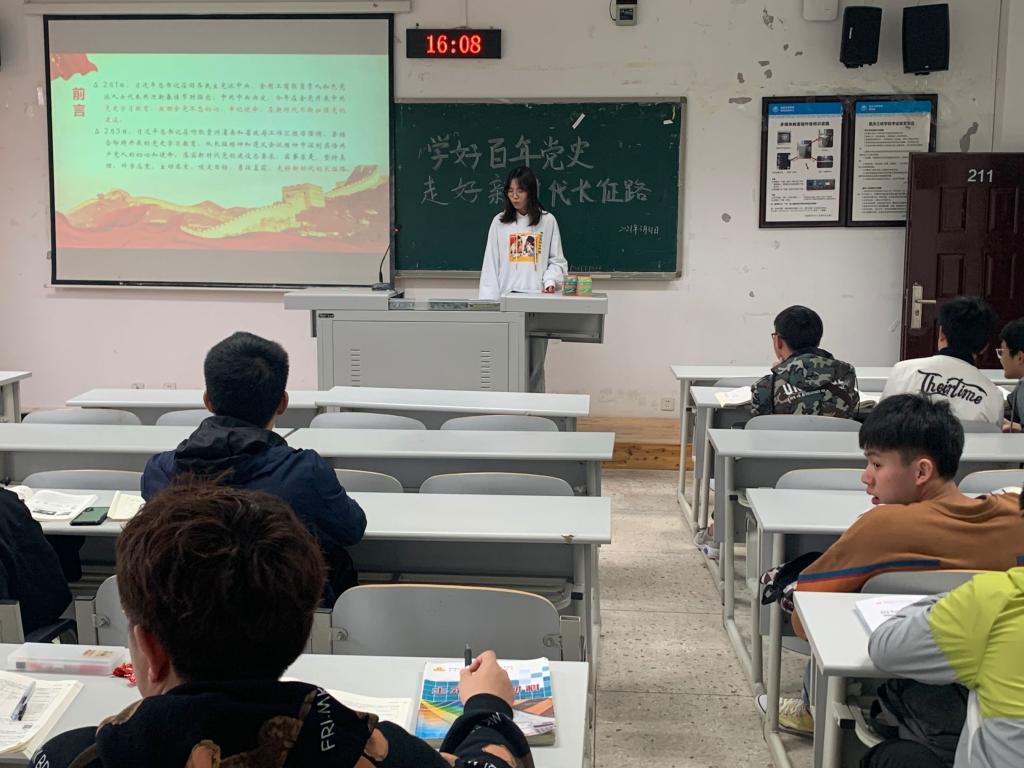 3月31日下午,学院学生党支部党员刘鑫以“学好百年党史,走好新时代长征路”为题,为2019级土木工程类专业1班全体共青团员讲党史“微党课”。辅导员杨楠现场指导并点评。