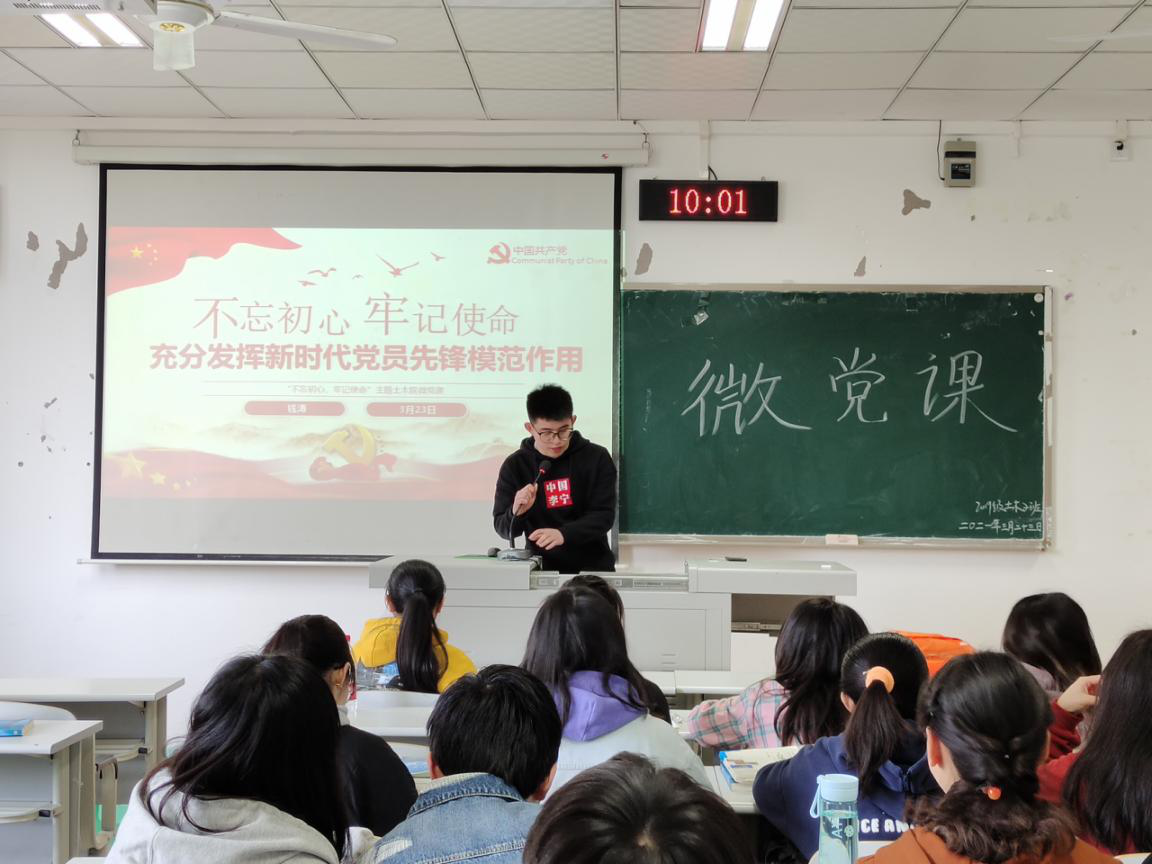3月23日上午,44118太阳成tyc城集团党总支学生党支部党员钱涛以“不忘初心、牢记使命”为题,为2019级土木工程专业2班全体共青团员讲党史“微党课”。