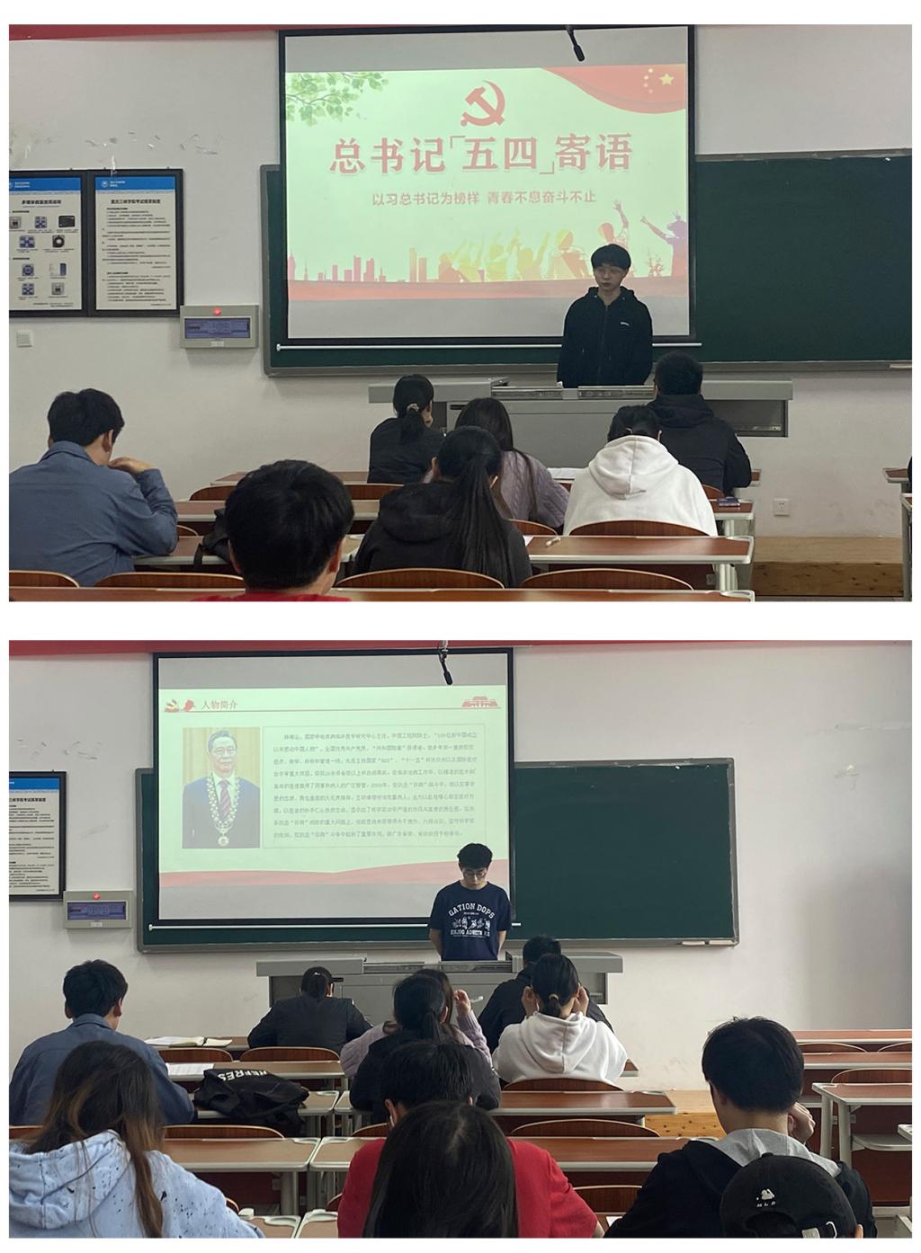 陈鹏、陈佳豪分别组织了“知敬钟南山事迹、学不朽精神”、“习总书记‘五四’寄语——以习总书记为榜样,青春不息奋斗不止”两个主题的理论学习。陈鹏以钟南山院士的事迹为基点,赞颂钟南山院士以实际行动诠释了“人民至上、生命至上”的使命担当,践行了一名共产党员的不变初心,鼓励广大青年要认真学习、传承、发扬这种敢言敢做、勇于担当的精神。陈佳豪以习近平总书记的成长经历为例,佐以习近平总书记在北京大学考察时的寄语—“忠于祖国、忠于人民”、“立鸿鹄志、做奋斗者”、“求真学问、练真本领”、“知行合一、做实干家”,讲述一代人有一代人的使命,青年人有青年人的担当。作为当代青年应当朝气蓬勃、好学上进、视野宽广、开放自信,可爱、可信、可贵、可为,积极同新时代共同前进。