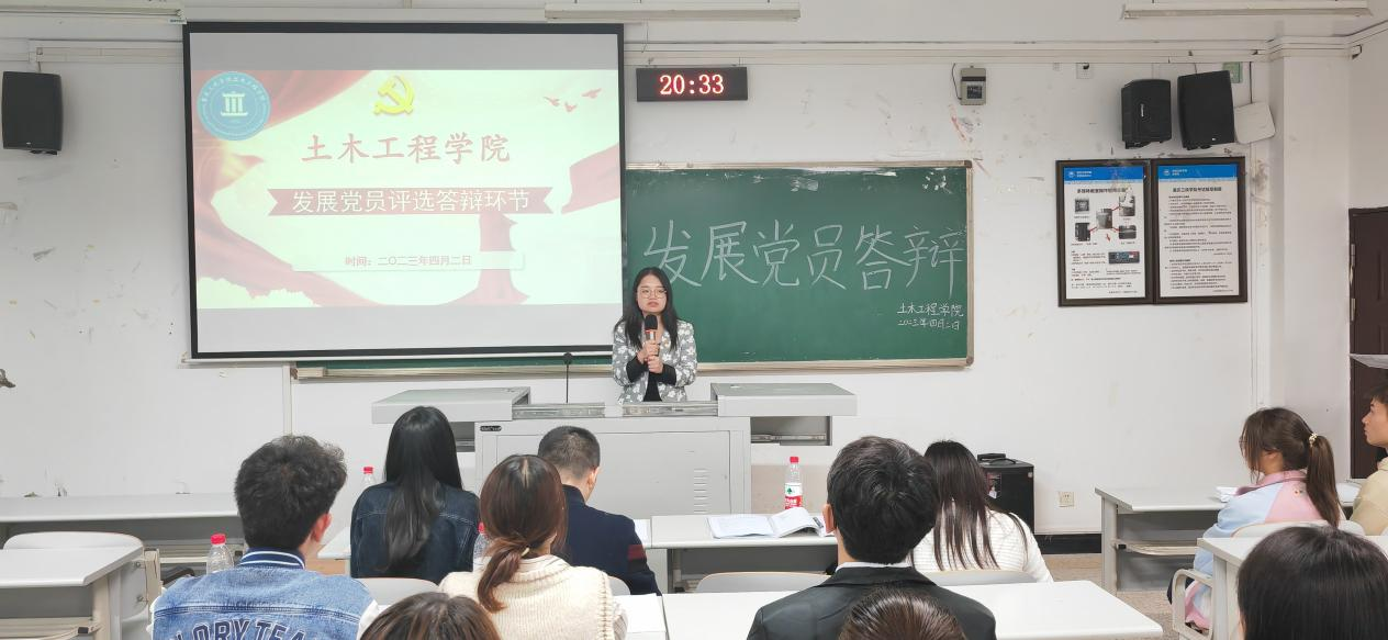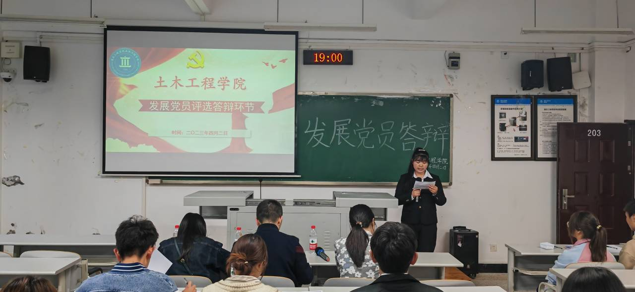 2023年4月2日晚,我院举行2023年拟发展对象答辩会。学院学生第一党支部书记杨楠、学生第二党支部书记尹鸿、学生党支部委员等6人担任评委,经团组织二次推优和党员推荐、资格审查,14名积极分子参加答辩。