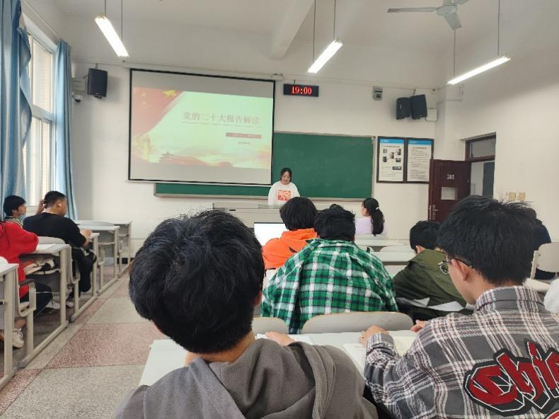 学生党员罗兰从中国共产党波澜壮阔的百年历程出发,讲解了中国共产党带领中国人民取得今天的伟大成就的根本原因,号召大家作为新时代的中国青年,应当树立远大理想、勇于砥砺奋斗、练就过硬本领、锤炼品德修养。学生党员黄苹苹带领大家学习了习近平总书记在中国共产党第二十次全国代表大会闭幕会上的重要讲话、《中国共产党第二十届中央委员会第一次全体会议公报》等内容,在党的二十大报告学习分享中提到,党的二十大报告擘画了宏伟蓝图,大会对过去五年的工作和新时代十年的伟大变革做出了总结,并对“加强构建新发展格局,着力推动高质量发展”“实施科教兴国战略,强化现代化建设人才支撑”等几点进行展开阐述。她着重指出全体同学应当加深了对党的二十大精神的理解和感悟,在实践中磨炼自己,争做新时代有理想、有追求、有担当、有作为的合格大学生。