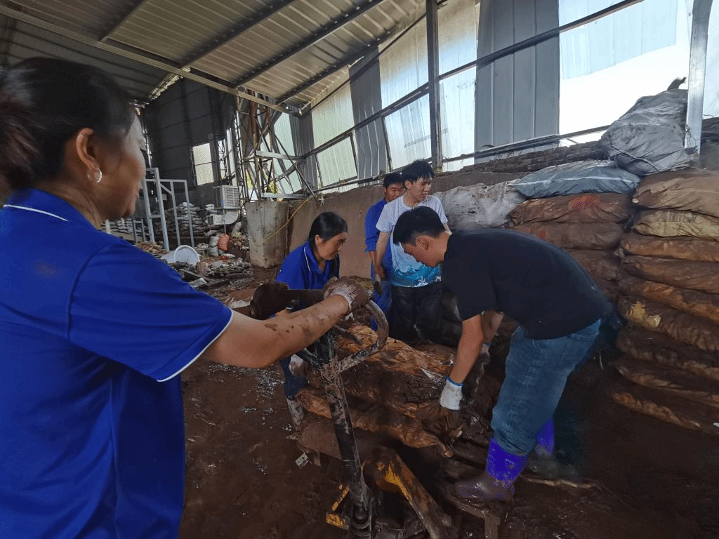 学生党支部书记杨楠、尹鸿带领大家前往长岭镇泳昌护栏厂,现场淤泥深厚、积水较多,空气中弥漫着难闻的气味。党员老师们带头冲锋,同学们紧随其后,充分发场土木学子不怕苦,不怕累的精神,踏进厚厚的淤泥中,拿起扫把、铁锹等工具,分片包干,分工协作,清理洪水过后形成的淤泥、积水、垃圾,从车间中抢运生产物资,虽然脸上满是汗水、衣服粘上泥浆、手掌磨出了血泡,但大家始终热情高涨,干劲十足。