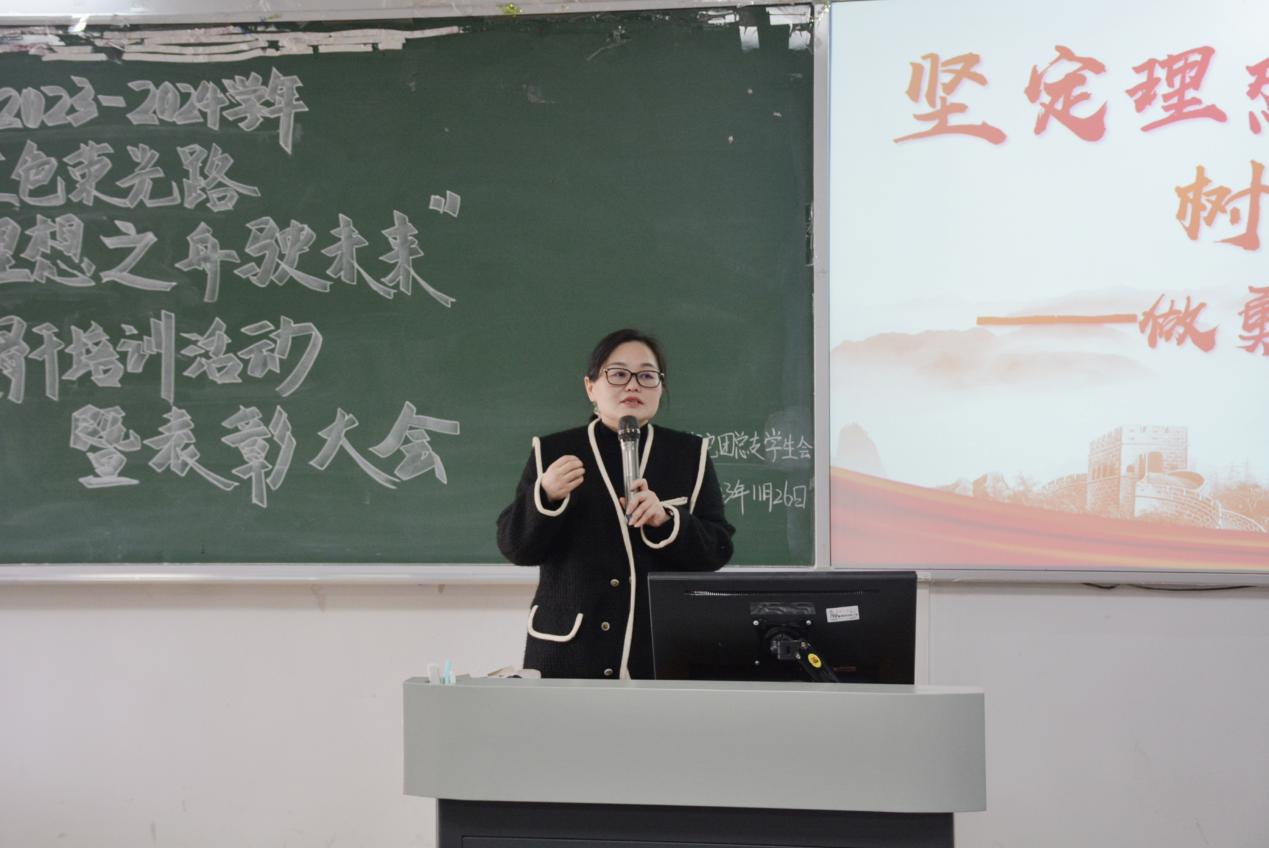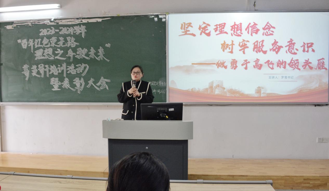 为深入学习贯彻习近平新时代中国特色社会主义思想,坚持不懈用党的创新理论凝心铸魂,积极响应新时代对青年德智体美劳全面发展的殷切希望,加强学生干部的服务和责任意识,11月26日下午,学院在博学楼1-101开展“坚定理想信念 树牢服务意识——做勇于高飞的领头雁”专题党课培训,本次专题培训由学院党总支书记罗雪主讲,各年级辅导员及团总支学生会全体学生干部参与此次培训。
