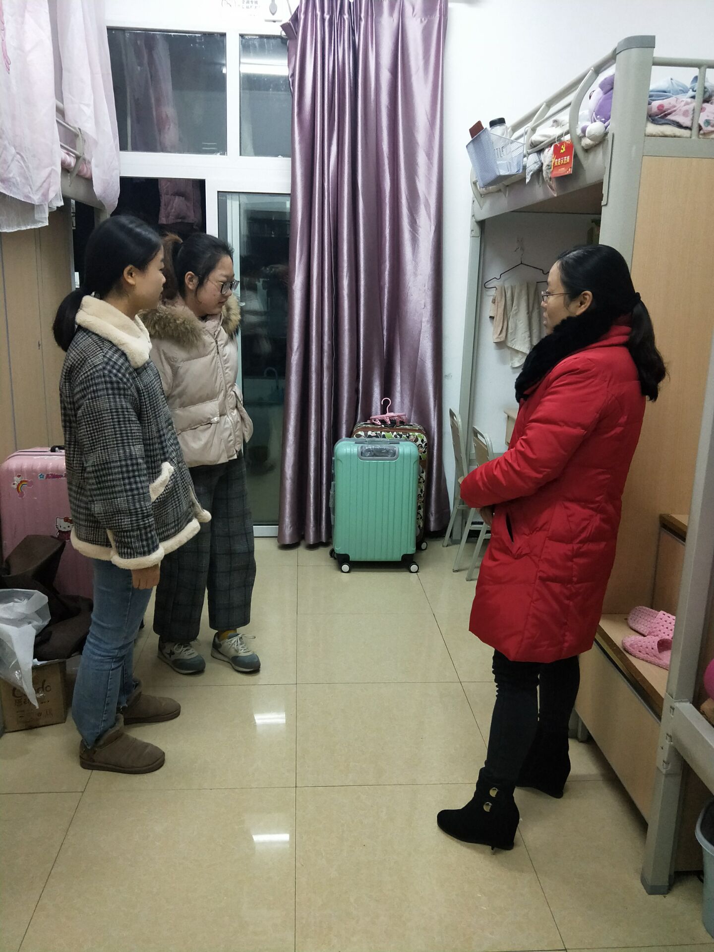 12月19日晚,44118太阳成tyc城集团党总支副书记张小梅、学工办副主任洪鹏、辅导员王刚、谭玥等4人兵分两组走访了学生寝室,了解学生学习、生活困难和思想动态、心理健康状态。