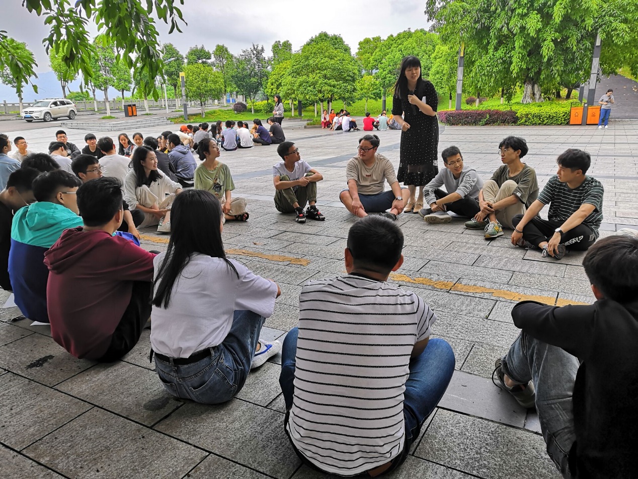 蔡贞老师首先讲述了关于人际交往中的沟通技巧以及接下来的团体辅导活动中所涉及的方式方法,随后带领大家来到明辨楼1栋广场进行户外辅导。