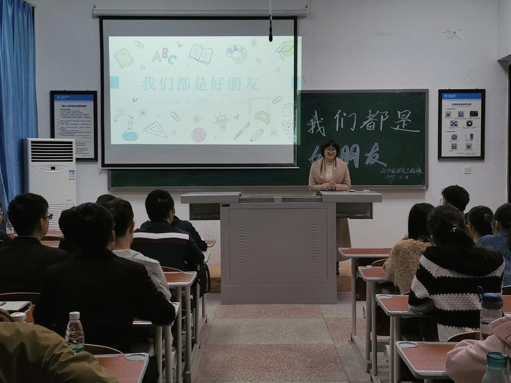 为进一步推进素质教育,加强和改进学生心理健康,提高学生心理调节能力,培养良好心理品质,11月11日,44118太阳成tyc城集团2019级安全工程班在慎思楼5栋307教室开展了“我们都是好朋友”心理健康教育主题班会,班会由辅导员谭平老师组织,心理委员李卓容和张浩楠主持,班级全体同学参加班会。