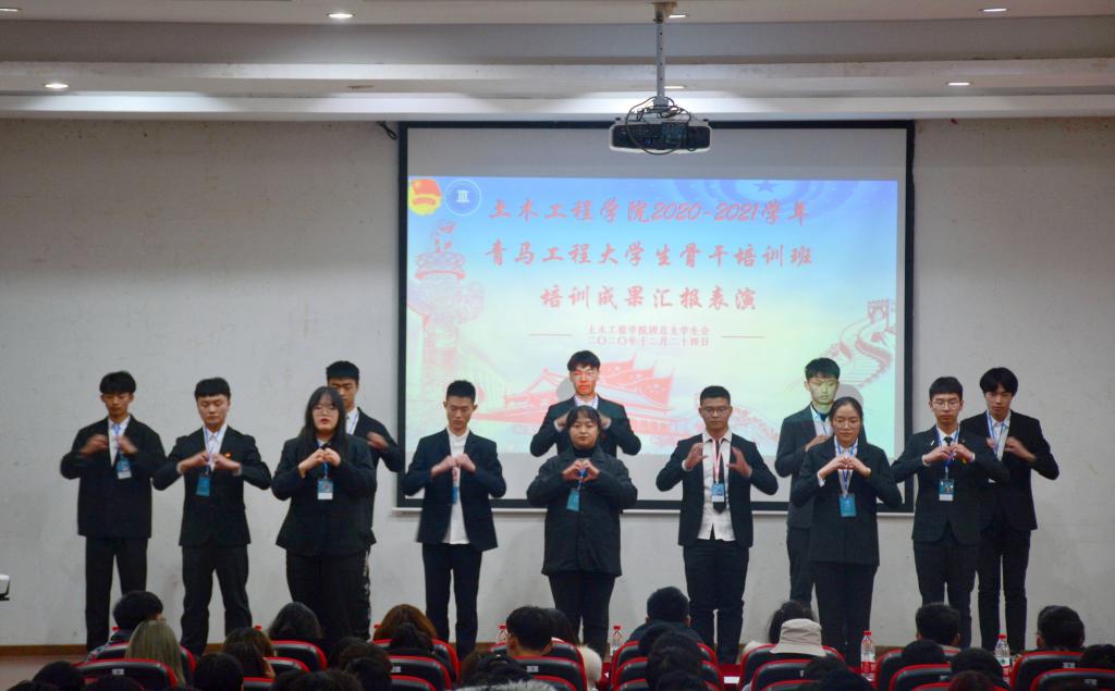 为不断提高大学生骨干、团干部等青年群体的思想政治素质、政策理论水平、创新能力、实践能力和组织协调能力,使他们进一步坚定跟党走中国特色社会主义道路的信念,成长为中国特色社会主义事业的合格建设者和可靠接班人,44118太阳成tyc城集团开展了为期两个多月的青马工程·精英团校培训班,并于12月24日下午在明辨楼2栋104报告厅举办了2020-2021学年青马工程大学生骨干培训活动结业典礼暨成果汇报大会。学院党总支副书记张小梅、团总支副书记洪鹏、各年级辅导员、主席团成员出席担任活动评委,青马工程培训班全体成员、院学生社团代表及高年级各班级学生代表参加。