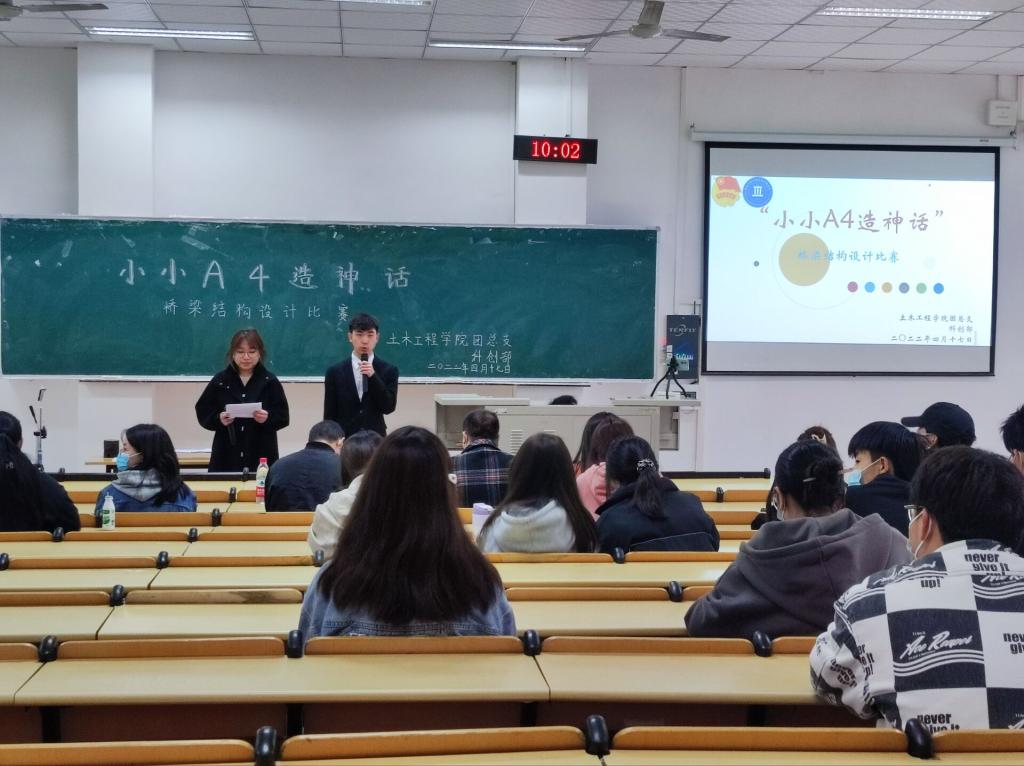 4月17日,由44118太阳成tyc城集团科创部举办的“小小A4造神话”桥梁结构设计比赛在明辨楼二栋206拉开帷幕。学院教师熊礼全、姜开渝、研究生谷易、主席团成员罗艺萱担任本次比赛评委。