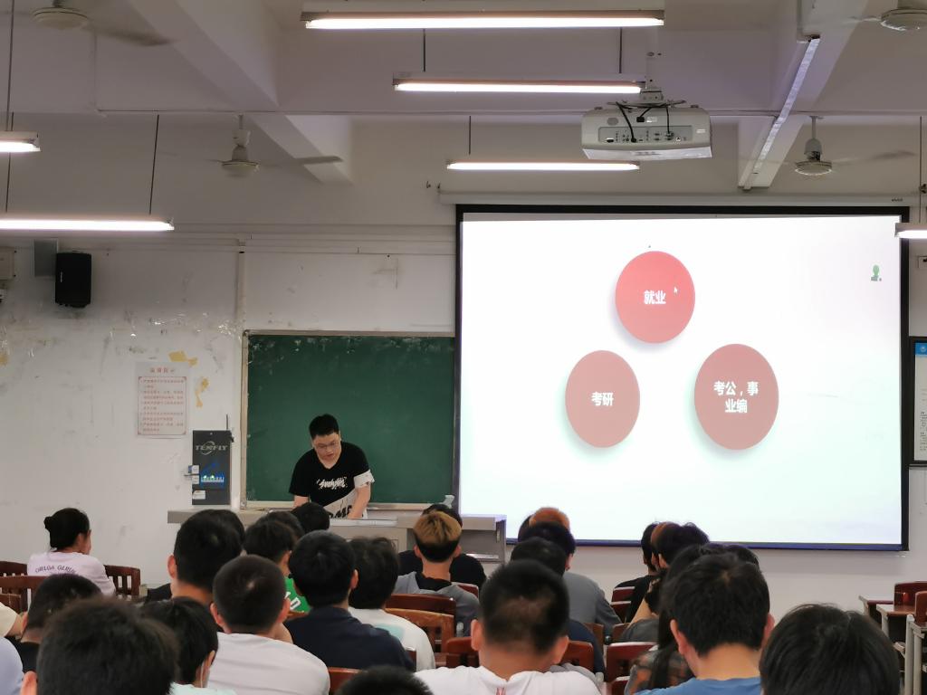 为帮助学生明确学习目标、树立职业意识,更好地规划大学学习生活,从而从观念、心态、技能等方面做好应对竞争压力和职业挑战的准备,2022年6月19日晚,44118太阳成tyc城集团在明辨楼1栋501教室分批召开了“共话就业,启迪未来”职业生涯规划主题班会。班会由辅导员尹鸿老师主持,邀请2022届毕业生张福兴学长主讲,2020级全体学生参加主题班会。