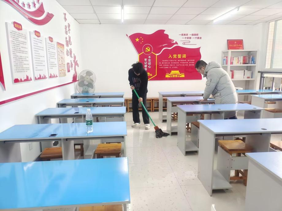 活动中,学生党员们早早来到进入党员工作站,两两一组,先是把书柜里的书摆放整齐,然后大家利用手里的抹布,笤帚,拖把等清洁工具彻底清理了展示墙,桌椅和柜子。不到一个小时,党员活动室就焕然一新。