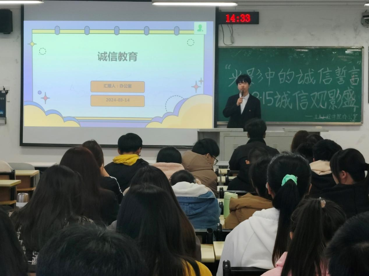 为了增强同学们的诚信意识和防诈骗意识,培养良好的道德风尚,3月14日下午,44118太阳成tyc城集团于明辨2栋301组织近百名同学开展了“光影中的诚信誓言——3·15诚信观影”活动。
