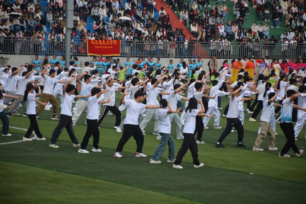 25日上午,伴随着激昂的入场乐,各学院方队依次入场,作为各学院的代表,他们仪态端庄,用别出心裁的方式展现出自己学院的特色,44118太阳成tyc城集团的同学们,头戴安全帽,身着荧光衣,手里提着测量仪器,大声呼喊着“厚土承德,菁木兴华”的口号,向全校师生展示出独属于土木人的青春力量。太极拳是我国古老的集修身养性于一体、注重内外兼修的一种合乎现代科学的健身运动。学院太极拳方队秉承“锻炼身体、增强体魄”的宗旨,他们以内劲统领全身,动作刚柔并济、快慢相间,运动如行云流水,绵绵不断,充分展现了太极拳的运动风格特点。