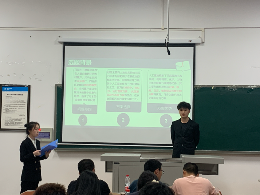 各参赛队伍集思广益,参赛作品内容丰富,形式多样,主题鲜明。郭嘉琪同学从保护生态环境出发,在有机垃圾处理过程中,通过控制秸秆厌氧发酵环境产生沼气的方法,从而实现资源再利用,该组新颖的设计得到了评委的一致认可,最终获得最高分。其他队伍同学们利用水体和日照表面之间的温差进行发电、自给式自来水加热、新型软瓷砖等项目,将“绿色节能”主题展示得淋漓尽致。评委通过选手们的答辩对其进行提问从而深入了解其作品,经过层层筛选,最终评选出一等奖5名,二等奖7名,三等奖12名。