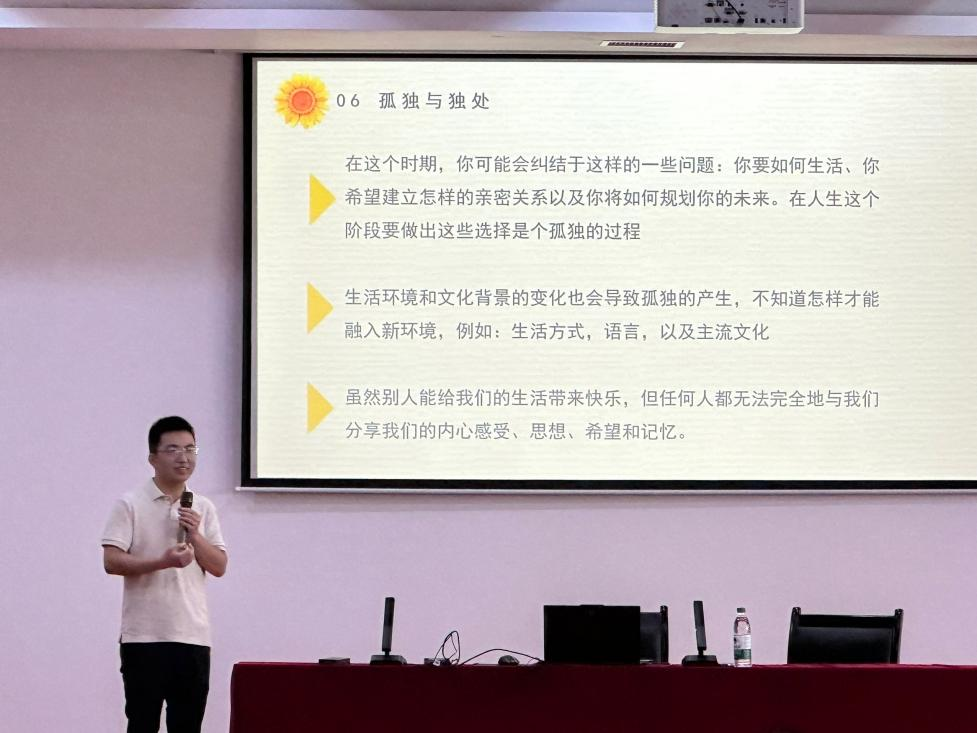 李老师以大学适应性教育和心理健康为主题,从人际交往、学业适应、自我认知、情绪调节四个方面,通过案例分析的形式,告诉同学们良好的心理适应能力有助于新生们更快地融入集体,建立自信,形成积极向上的生活态度能更快融入大学生活。他强调,大学生活是一个全新的开始,新生们可能会面临各种挑战和压力,适应大学可以从日常作息、宿舍生活、个人卫生等多个方面入手,细致入微地讲解了如何在校园中建立良好的生活习惯,与寝室同学和谐相处。建议大家从现在开始培养独立的生活能力,学会时间管理,合理规划自己的生活,积极参加各项活动,丰富自己的大学生活。同时,他还介绍了学校的心理健康资源和服务中心建设情况,同学们在遇到困难时,也可以拨打中心预约热线,及时获得帮助。最后,他祝愿每一位新同学都将以更加饱满的热情和坚定的信心迎接未来的挑战,满怀信心与期待地踏上新的征程。