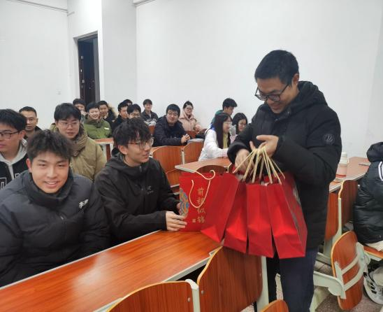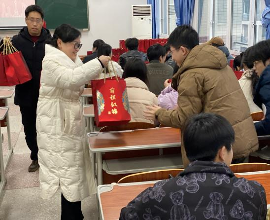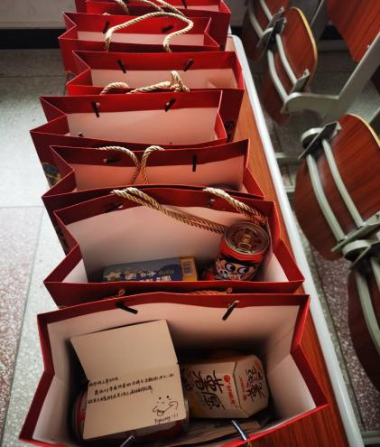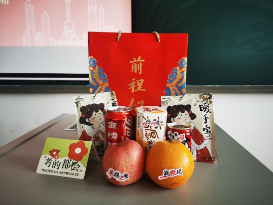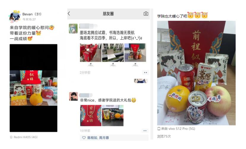 活动最后,与会领导和老师为同学们送上暖心祝福和“考研加油包”。拆开印有“前程似锦”的礼包,内有寓意“如你所愿、神来气旺、一战橙硕、苹稳上岸的水果和饮品,以及学妹学弟手写的祝福贺卡,每一样礼物都承载了学院对考研学子满满祝福,祝愿大家都能够一战成硕、金榜题名。接受慰问的同学们也纷纷在朋友圈分享收到此份关怀与祝福,并表示领导老师们的关心让他们感到十分温暖和备受鼓舞,会在最后的阶段抓住机会、迎难而上,争取上岸,不负厚望!