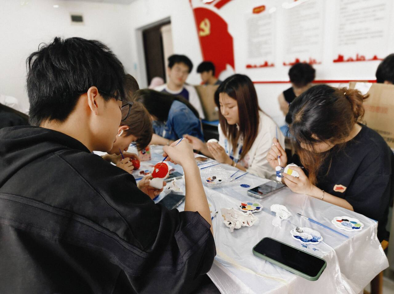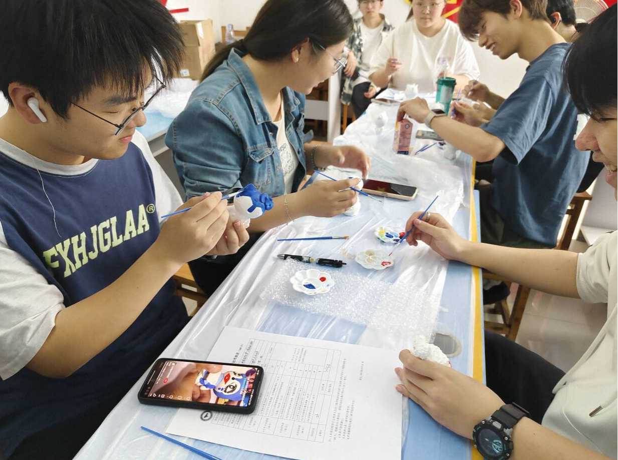 活动伊始,形态各异的石膏娃娃整齐摆放,憨态可掬的卡通形象、充满故事感的经典角色,现场便洋溢着浓厚的创作热情。同学们通过色彩随意搭配,细致勾勒人物细节,少数同学将表情包等流行元素融入作品,打造出个性十足的设计。现场不时传来讨论配色方案的交流声,同学们欢声笑语,形成独特的协作氛围。