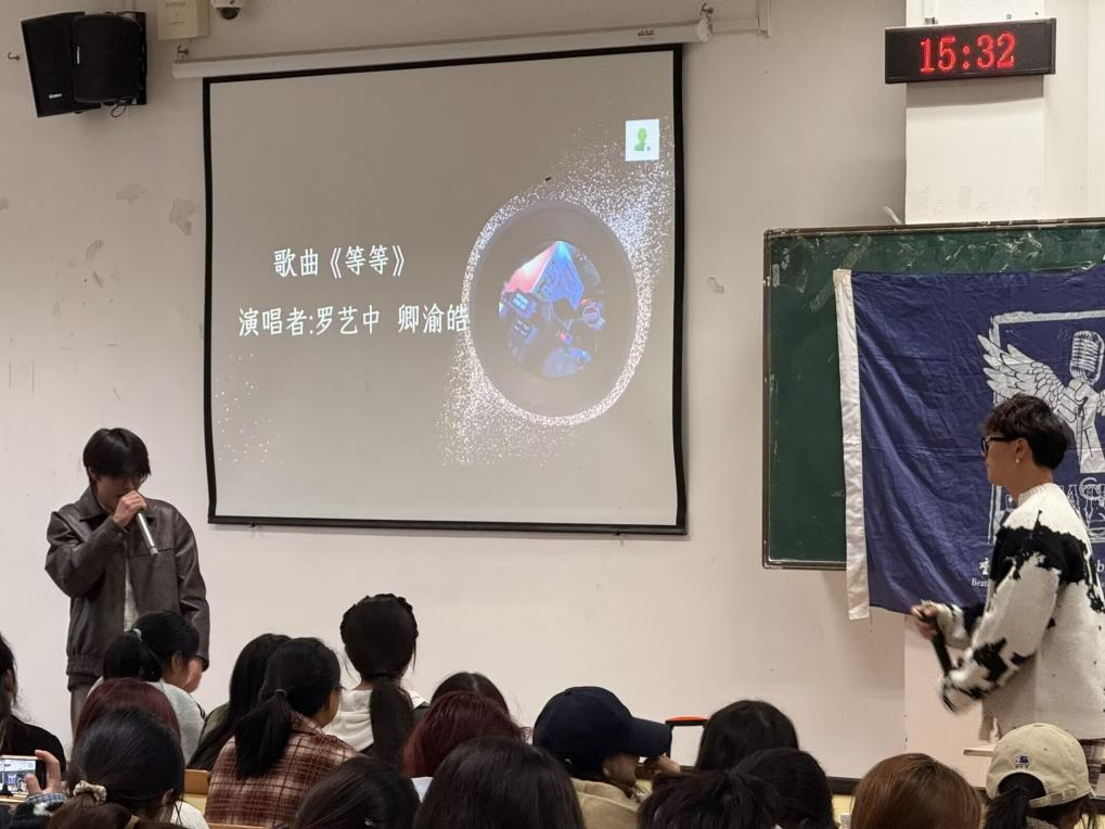 活动伊始,主持人对会员们的到来表示欢迎,并简要介绍了本学期的活动规划。在才艺展示环节,同学们带来了《突然好想你》、《泡沫》二重唱、《NOT GOOD》、《明天》等一系列精彩曲目,充分展现了扎实的音乐功底和舞台表现力,赢得了在场观众的广泛赞誉。活动还巧妙设置了“看图猜歌名”、“天马天马驾驾驾”等互动游戏,有效调动了观众的参与热情。同学们在游戏中积极互动,不仅增进了彼此了解,也将现场气氛一次次推向高潮。