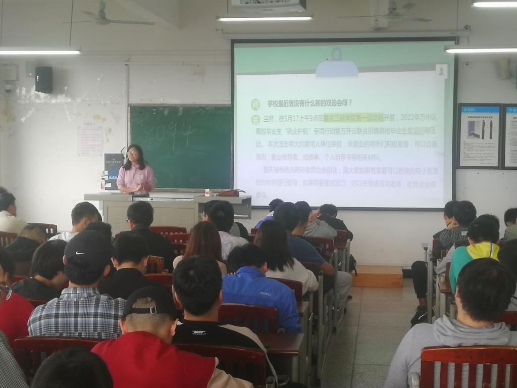 辅导员刘艳玲对专项招聘、应征入伍、西部计划、三支一扶等基层就业项目做了宣讲动员,鼓励未就业学生树立家国情怀,主动到艰苦地区和行业建功立业。详细介绍了2022年万州区高校毕业生“就业护航”专项行动暨万开云联合招聘高校毕业生专场招聘活动。