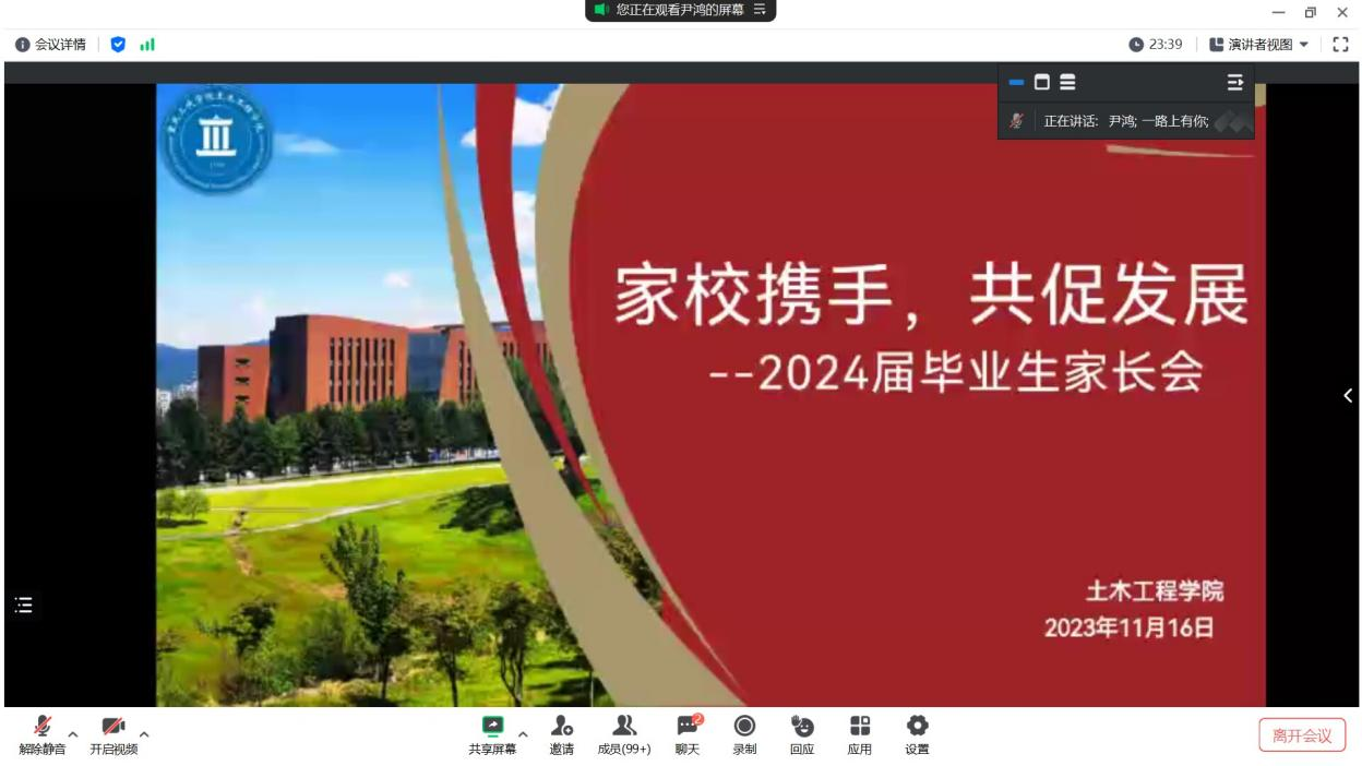 会上,尹鸿告知毕业生家长学生学分修读、毕业设计和实习实践的要求和时间节点,通报了目前学院就业工作,2024届毕业生的生源情况和就业意向,并结合2023届学生就业去向和升学情况,分析当前毕业生严峻的就业形势。希望家长帮助学生拓宽就业渠道,助力精准就业,希望家长们能够在三个方面和学校一起努力,一是帮学生做好就业规划,树立正确的就业观,走好迈向社会的“第一步”。二是面对就业和考研压力,多多关注学生的身心健康,做到每日关心、勤加沟通。三是加强家校联动,希望家长主动了解学生在就业方面的需求和难点,通过家校之间的沟通协作,打通学生就业工作的最后一公里,助力学生高质量就业。