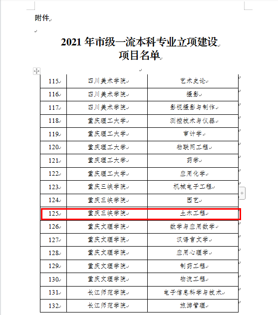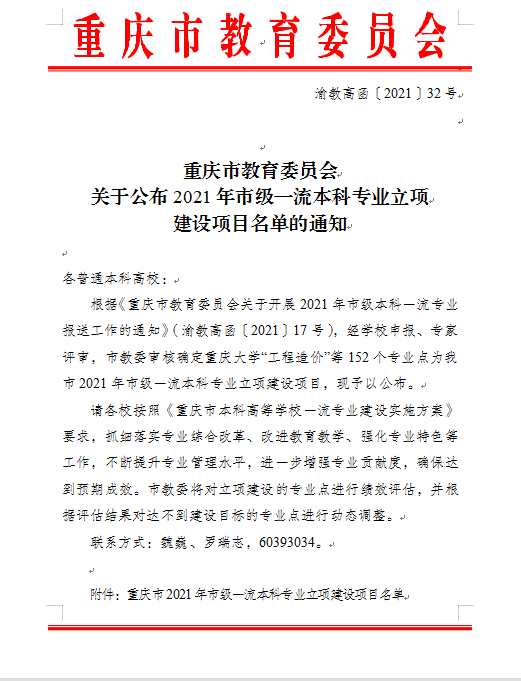 日前,重庆市教育委员会下发了“关于公布2021年市级一流本科专业立项建设项目名单的通知”,我院土木工程专业成功获批重庆市一流本科专业。