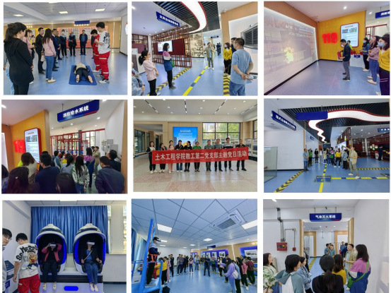 5月11日下午,教工党支部组织党员赴重庆安全技术职业学院参观公共安全体验馆,在公共安全体验馆馆长的带领下,老师们首先通过VR智慧党建系统体验了“辉煌中国”的虚拟展馆参观,通过沉浸式逼真的学习体验,让大家重温了中国崛起的辉煌历程。之后又参观了安全科普馆,重点学习了消防知识、消防技能实战培训、心肺复苏、结绳训练、缓降逃生和应急避险、自救、互救等安全知识。选择了施工安全、火场逃生、交通驾驶安全、多场景公共安全、查找安全隐患等VR多场景体验等。