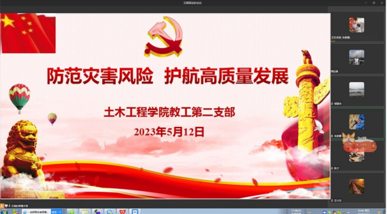 5月12日,教工第一党支部和第二支部通过企业微信会议分别开展了政治理论学习,学习了《习近平新时代中国特色社会主义思想专题摘编》相关内容和习近平总书记关于安全生产、防灾减灾的重要论述,观看了《2023年5.12全国防灾减灾日教育宣传片》。
