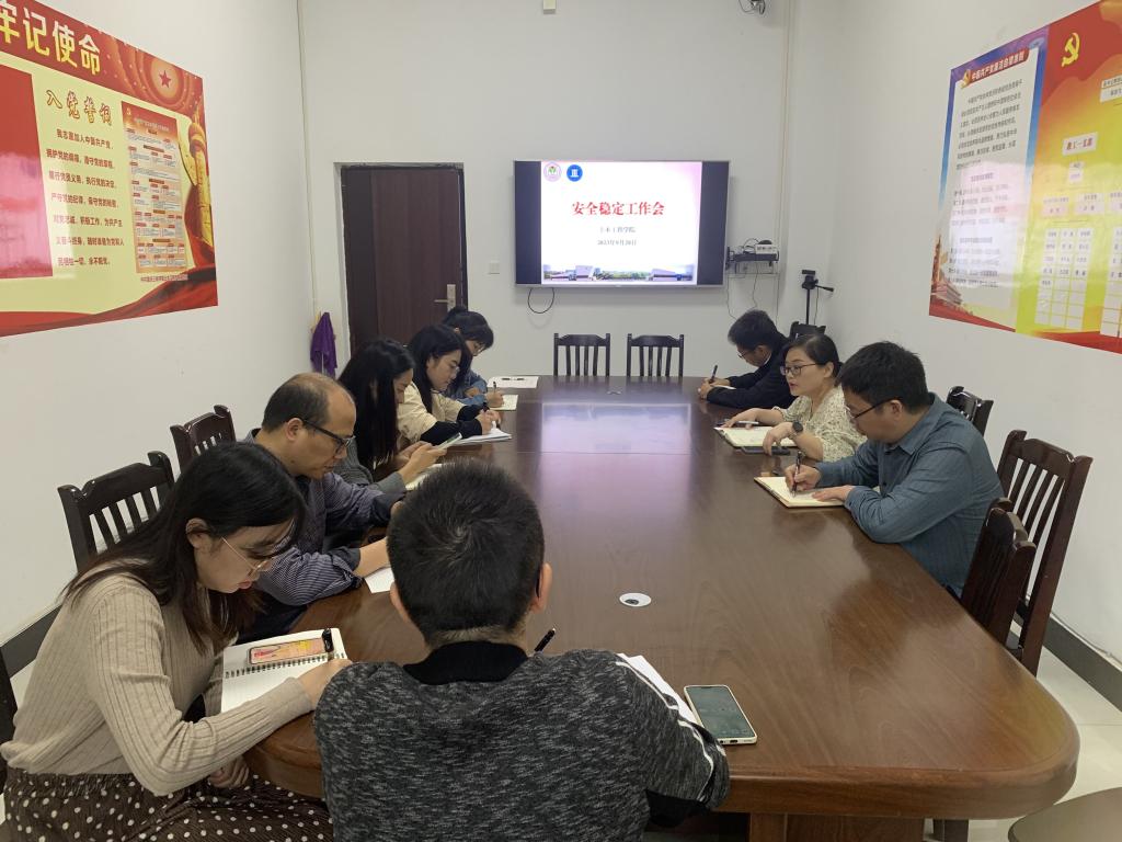 党总支书记罗雪传达学校安全稳定工作会议精神,对安全教育、国庆中秋双节师生去向统计、安全排查等工作进行了部署,要求大家要以时时放心不下的状态高度重视安稳工作;以苦口婆心毫不放松的方式进行安全教育;以细之又细严之又严的作风进行安全排查。进一步统一思想、压实责任、强化落实,抓好中秋国庆双节期间安全防范各项工作。同时,与会人员也针对各项情况进行了研判讨论,并进一步细化工作措施。院长程龙飞要求大家统一思想,以高度的责任感和严谨的态度做好双节期间安全工作,牢固树立“安全无小事”的理念,排查安全隐患,强化督导检查,落实值班值守,确保和谐稳定。