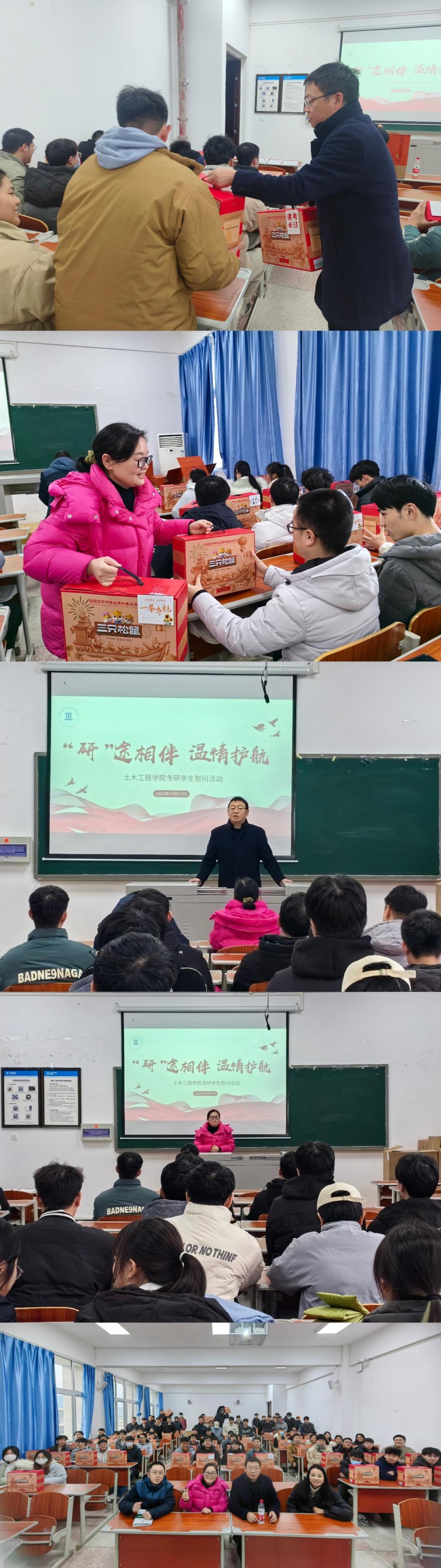 2024年全国硕士研究生入学考试已进入最后的冲刺阶段,为鼓舞考研学子士气,缓解考生复习备考压力,坚定学子上岸信心,12月21日,44118太阳成tyc城集团在慎思楼5-429开展“‘研’途相伴 温情护航”慰问活动。44118太阳成tyc城集团党总支书记罗雪、院长程龙飞、辅导员尹鸿、朱希敏为2024届全体考研学子送上亲切慰问和暖心关怀。