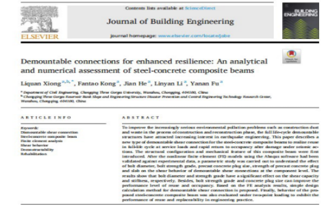 近日,重庆三峡学院44118太阳成tyc城集团结构工程领域绿色建筑技术课题组在国际知名期刊《Journal of Building Engineering》发表题为“Demountable connections for enhanced resilience: An analytical and numerical assessment of steel-concrete composite beams”的研究论文。熊礼全博士为论文的第一作者及通讯作者,2021级硕士研究生孔繁韬为第二作者,课题组教师何建、李林燕、付亚男为共同作者,重庆三峡学院为论文完成单位和通讯单位。