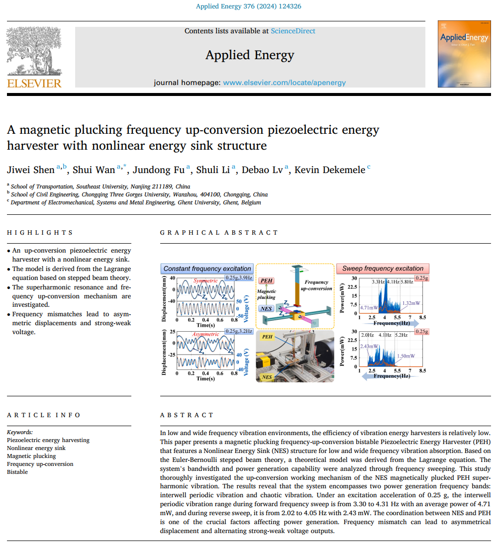 2024年8月,重庆三峡学院44118太阳成tyc城集团在国际知名期刊《Applied Energy》发表题为“A magnetic plucking frequency up-conversion piezoelectric energyharvester with nonlinear energy sink structure”的研究论文。申纪伟博士为论文的第一作者,其定向培养单位为第一完成单位,重庆三峡学院为第二完成单位。