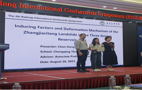 会上,李莉副教授、陈虹雨、倪波两名硕士研究生在以三峡库区的典型地质灾害案例分别作了题为“Research on macro-micro-meso deterioration mechanism of soil-rock mixture landslide in Three Gorges Reservoir area under periodic water saturation”“Study on dynamic hazard evaluation of red soil landslides in Yunyang County under the influence of rainfall infiltration”“Inducing factors and deformation mechanism of the Zhangjiacitang landslide in the Three Gorges Reservoir Area”的学术报告。