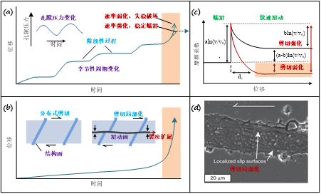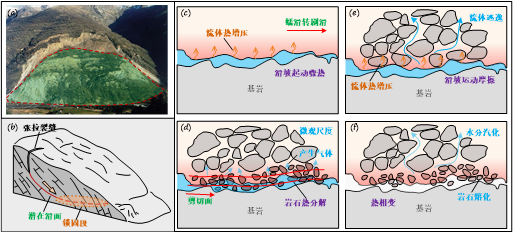 锁固段通常具有扁平状与大尺度的几何特征,且演化过程具有明显阶段性,特别是失稳前必出现显著加速蠕滑阶段。锁固段亚临界裂纹扩展渐进性破坏引起岩石剪切局部化的速率强化-弱化转换机制是问题的关键。例如,即使滑坡剪切带富含粘土在低速率表现为速率强化,发生稳定蠕滑,但在动水驱动、剪胀效应、剪切液化等动态滑动显著弱化的情况下也可能具有较大的破坏性。若滑坡以不规则颗粒集合整体崩落或剪切层非常厚,渗流和剪切扩容造成的扩散效应超过温升增压效应,热量容易消散而不会形成摩擦薄层,热致孔压很难长久保留下来作为地质证据。锁固型滑坡起动断裂时释放部分弹性应变能,骤热(flash heating)增压作用更强;运动阶段似刚体滑动的摩擦热较崩落、滚动等其他形式更显著。