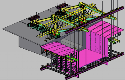 本工程挂篮拟选用移动菱形挂篮结构,挂篮主要由承重结构、吊挂系统、锚固系统、行走移动系统、模板系统组成。