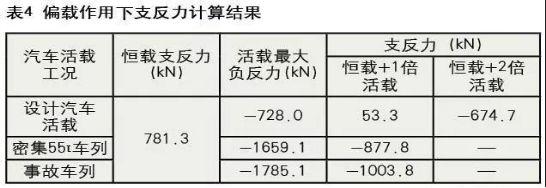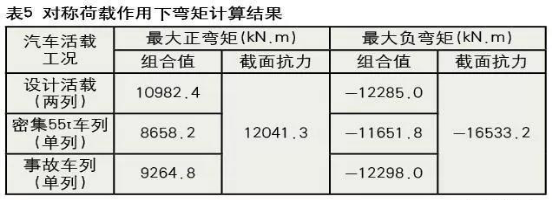 从对称荷载作用下截面最大弯矩的计算结果(表5)可以看出,在单列密集55t车列和事故车列的作用下,截面的最大正弯矩值和最大负弯矩值均与设计活载作用下的结果相当,并且组合值均小于截面抗力。