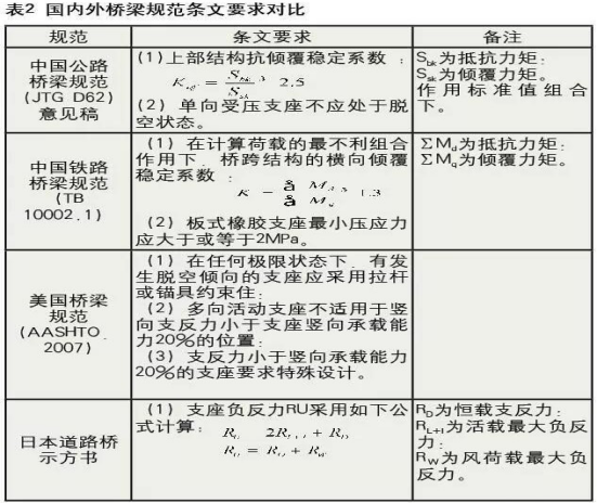 从表2可知,中国公路桥梁规范和铁路桥梁规范均引入了按照刚体计算的抗倾覆稳定系数,公路桥梁规范意见稿中考虑密集55t车列的工况,将安全系数定为2.5;美国桥梁规范明确了多向活动支座的最小竖向力不应小于其承载能力的20%,这与中国铁路桥梁规范中板式橡胶支座的要求基本相同,但前者更为全面;日本桥梁规范中在计算支座负反力时活载效应取用2倍的系数。上述规范的要求各有千秋。
