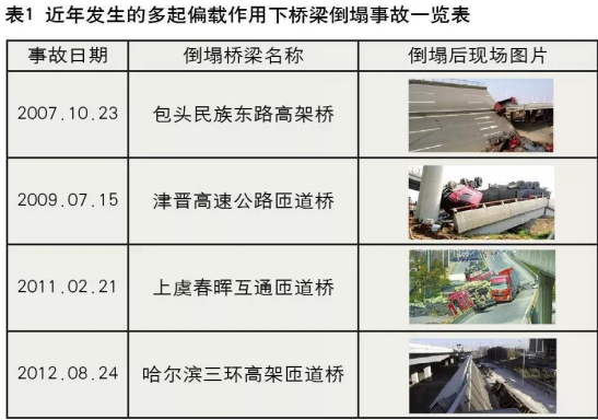 自从2007年10月23日内蒙古自治区包头市民族东路高架桥桥面发生倾斜以来,发生过数起箱梁桥在多辆重载车偏载作用下倒塌的事故(表1),造成了重大的人员伤亡和经济损失,并引发了极其恶劣的社会影响。