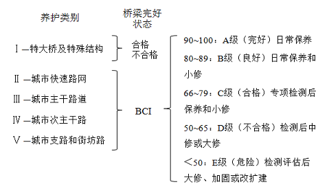 按照《养护规程》中桥梁技术状况的评定标准和评定方法,II~V类养护的城市桥梁采用先分部位再综合的办法,对桥面系、上部结构、下部结构等全桥进行评定,按桥梁状况指数BCI评定相应的等级(具有《养护规程》规定的直接评定为D级桥的情况时,不进行BCI值计算,直接评定为D级桥)。