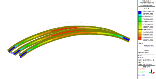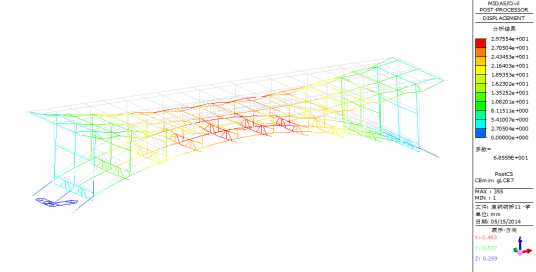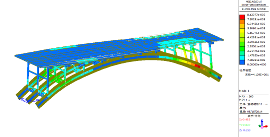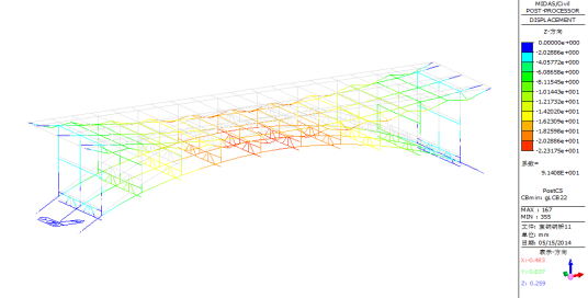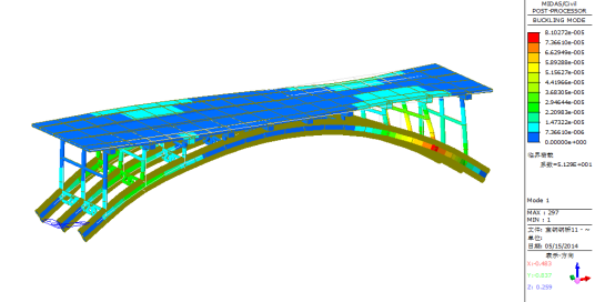 图27成桥阶段偏载1列车工况下全桥一阶屈曲模态(稳定系数:51.29)