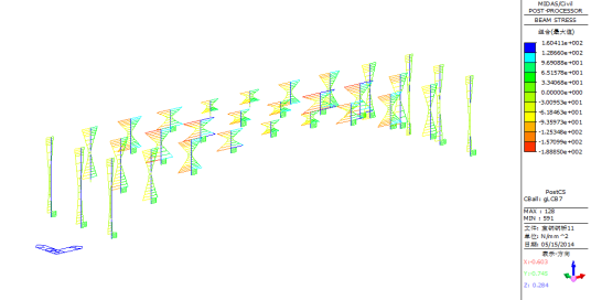 建模采用midas/civil2012有限元分析软件,按设计材料类型和截面尺寸建模分析弹性阶段最不利荷载工况下成桥阶段及施工阶段的受力性能;拱肋采用组合截面中的一般截面,梁单元建模,拱肋横撑、立柱及盖梁均采用梁单元建模,桥面板通过虚拟横梁等效为梁格体系,桥面板两端按简支梁体系连接;由于拱脚坐落在原桥基础上,可认为地基状况良好,拱脚均采用墩底固结形式;成桥阶段共划分为421个节点,601个单元,全桥离散图如下所示: