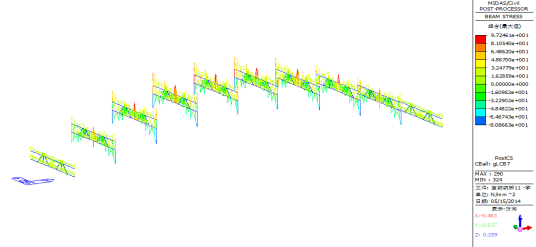 经计算,成桥阶段中载工况下全桥横向稳定系数为41.09,成桥阶段偏载1列车工况下全桥横向稳定系数为51.29,成桥阶段偏载2列车工况下全桥稳定系数为41.01,均满足《钢管混凝土拱桥设计规范》(校审稿)规定的不小于4.0的要求。