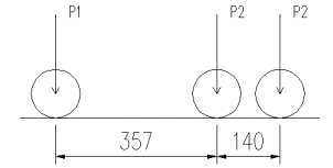 试验车采用两辆35t后八轮重车,轴距及加载图示见图5。前轮轴重P1=70kN,后轮轴重P2=140kN。