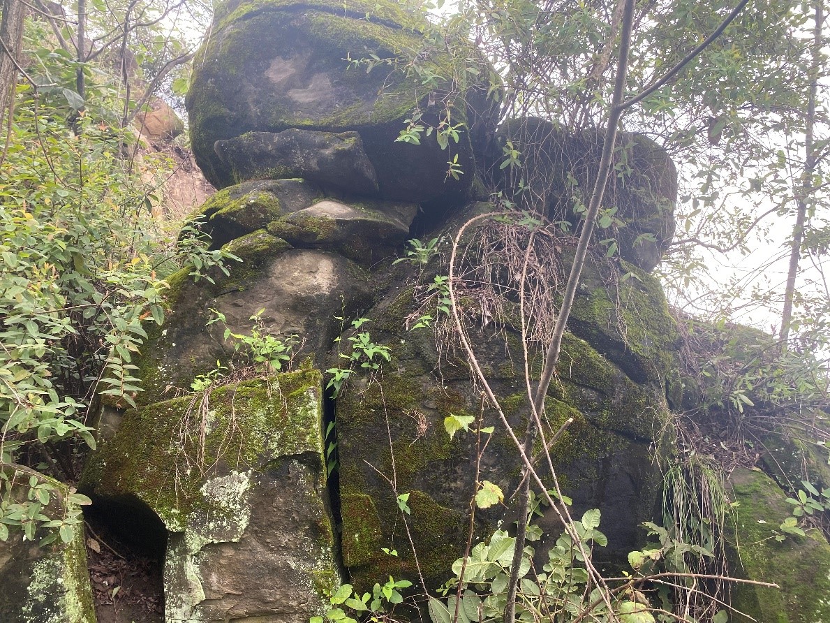 孤石堆GS01,其整体裂隙发育,基座为泥岩,局部岩腔发育,本次崩塌未出现加剧变形,整体处于基本稳定阶段,随着基座软化,或者降雨冲刷基座,可能出现失稳崩塌的风险。