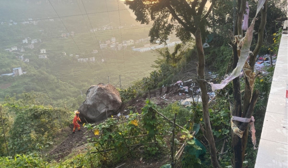 背景介绍:2021年8月30日22:22左右,重庆市万州区钟鼓楼街道桑树社区10组发生新生孤石崩塌突发灾情事件。崩塌处位于重庆市万州区钟鼓楼街道桑树社区10组,地理坐标北纬30.8434°,东经108.4170°,该点不属于群测群防点。经专家及技术队伍现场调查复核,发生崩塌的孤石位于山脊部位,由砂岩球状风化形成。受近期连续强降雨导致基座泥岩软化严重,发生崩塌,方量约400m3,其中崩落到下方公路及外侧的孤石约200m3,其中约40m3球状孤石崩塌砸毁坡脚桑树社区10组一户房屋,并致5人死亡,损坏村道20m,为高位崩塌,冲击力强,破坏性大。