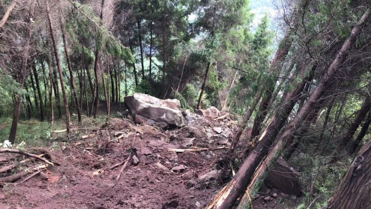 因孤石崩塌滚落,损毁树木形成坡面沟槽,斜坡堆积松散土体约720m3,在降雨条件下易失稳下滑。