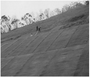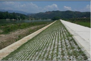 是将三维柔性材料铺在坡面上,上面覆耕植土植草,草根扎入边坡土与植物网缠绕,在边坡表面土中起加筋加固的作用,有效地防止表面土层的滑移,起到抗冲刷的作用。使用三维植物网植草后,绿草成片覆盖,体现“工程与自然协调”的概念,起到美化环境的作用,适用流速2.0~2.5m/s。