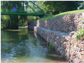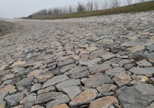 在金属网面中装入块石等填充料后连接成一体,具有柔性、对地基不均匀沉陷适应性较强,既可防止河岸遭水流、风浪侵袭而破坏,又实现了水体与坡下土体间的自然对流交换功能,达到生态平衡。坡上可增添景观、绿化效果。适用流速4.0~5.0m/s。