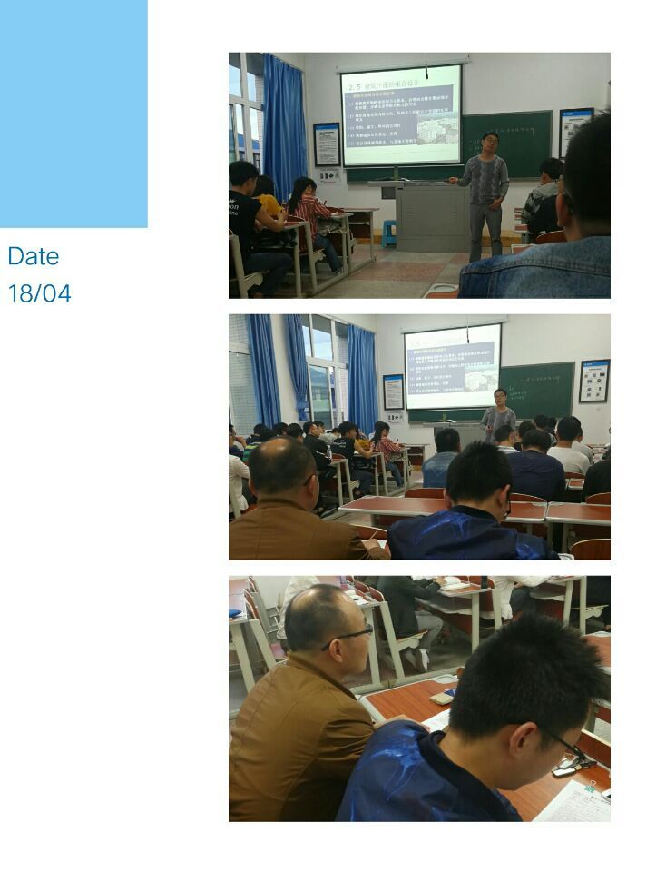 在随堂听课环节,领导带头课——程龙飞教授深入浅出,时有画龙点睛之笔;教授精品课——何泽平老教师结合工程实践,栩栩如生再展深厚功底;毛海涛博士化繁为简,将枯燥的结构力学讲的津津有味;骨干示范课——强跃老师结合亲身完成工程案例,把房屋建筑学引入现场建设中;青椒研讨课——唐鑫博士娓娓道来,弥漫着书卷气的味道;王正成老师一一分析,引人入胜,大有庖丁解牛之势……一系列的教学听课活动,不知不觉告一段落。