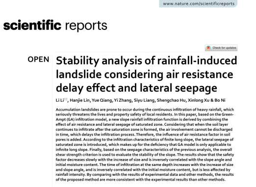 近日,我院强跃教授团队在国际知名期刊《Scientific reports》发表题为“Stability analysis of rainfall-induced landslide considering air resistance delay effect and lateral seepage”的研究论文。李莉副教授为论文的第一作者及通讯作者,2022级硕士研究生林涵杰为第二作者,课题组教师强跃、研究生张溢、梁思羽为共同作者,重庆三峡学院为论文完成单位和通讯单位。