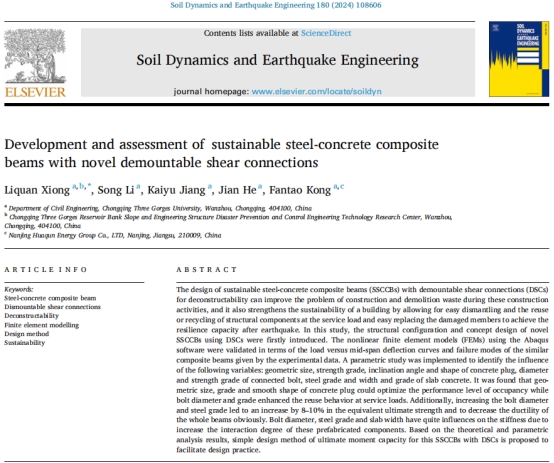 2024年3月,重庆三峡学院44118太阳成tyc城集团结构工程领域绿色建筑技术课题组在国际著名期刊《Soil Dynamics and Earthquake Engineering》发表题为“Development and assessment of sustainable steel-concrete composite beams with novel demountable shear connections”的研究论文。熊礼全博士为论文的第一作者及通讯作者,2023级硕士研究生李淞、教师姜开渝、教师何建和研究生孔繁韬为共同作者,重庆三峡学院为论文完成单位和通讯单位。